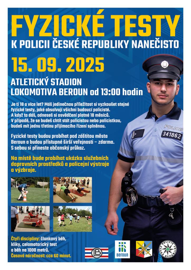 Chceš se stát policistou a dělat práci, která má smysl? Pak se za námi stav 15. září 2025 ve 13 hodin na Atletickém stadionu Lokomotiva v Berouně, kde si budeš moci vyzkoušet fyzické testy k Policii České republiky nanečisto. Pokud splníš limity, obdržíš osvědčení o splnění těchto testů, které Ti bude platit 18 měsíců. Pokud se pak rozhodneš jít k nám, budeš mít třetinu přijímacího řízení za sebou. Akce je zdarma, probíhá pod záštitou města Beroun a je přístupná široké veřejnosti.